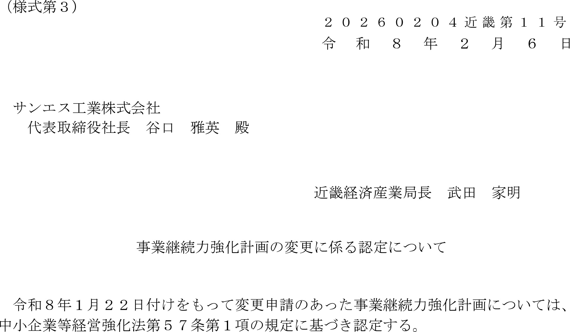 このたび、弊社は経済産業省より事業継続力強化計画に係る認定を受けましたことをお知らせ致します。